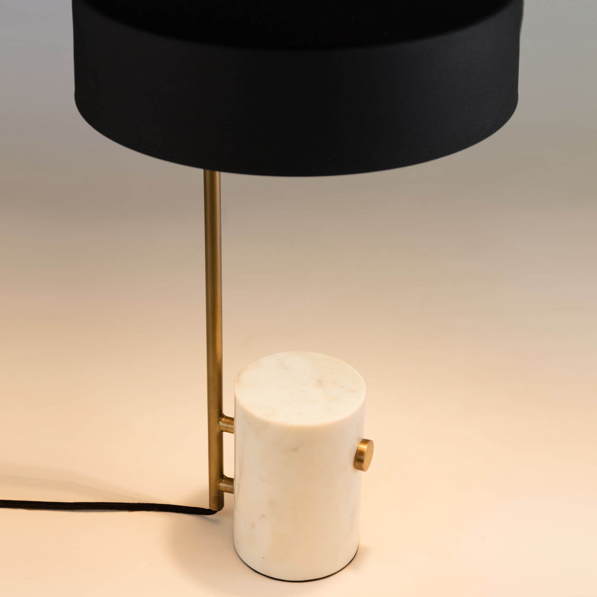 La lámpara de sobremesa Phant, importada de Europa, tiene una pantalla de metal con un acabado negro mate e interior blanco para una mayor luminosidad. El brazo dorado unido a una base de mármol completan un diseño inspirado en el estilo geométrico